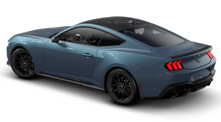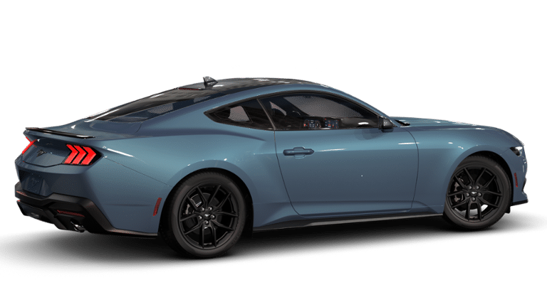 Mustang EcoBoost, 2D Coupe, EcoBoost 2.3L I4 GTDi DOHC Turbocharged VCT, 10-Speed Automatic, RWD, Vapor Blue Metallic, Space Gray w/Cloth/Vinyl Heated Bucket Seats, Black Front & Rear Pony Badges, Black Mirror Caps, Headlamps w/Black Bezels, Mustang Nite Pony Package, Painted Black Roof, Shadow Black Blade Decklid Spoiler, Wheels: 19 x 8.5 Ebony Black-Painted Aluminum.