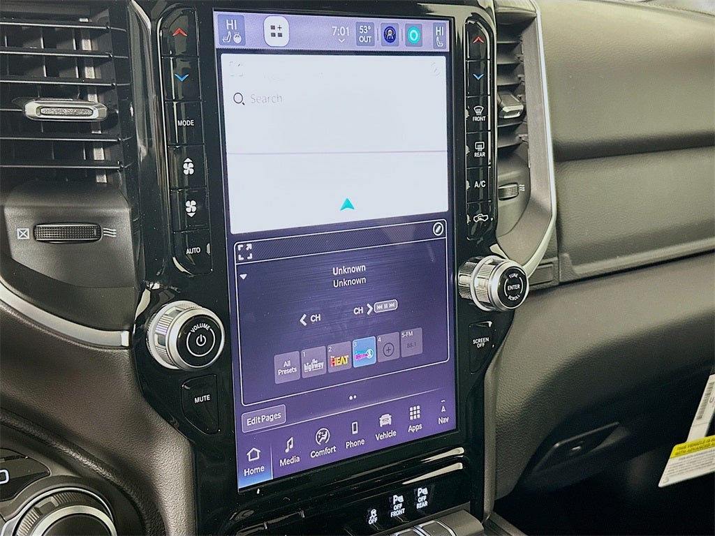 1500 Big Horn/Lone Star, 4D Crew Cab, HEMI 5.7L V8 Multi Displacement VVT eTorque, 8-Speed Automatic, 4WD, Billet Silver Metallic Clearcoat, 115V Auxiliary Power Outlet, 115V Auxiliary Rear Power Outlet, 12 Touchscreen Display, 2nd Row in Floor Storage Bins, 3 Rear Seat Head Restraints, 4 Way Front Headrests, 400W Inverter, 4G LTE Wi-Fi Hot Spot, 9 Amplified Speakers with Subwoofer, Accent Color Door Handles, Accent Color Premium Power Mirrors, Accent Color Tailgate Handle, Air Conditioning ATC with Dual Zone Control, Anti-Spin Differential Rear Axle, Apple CarPlay, Apple CarPlay/Android Auto, Auto High-beam Headlights, Auto Power-Folding Mirrors, Auto-Dimming Exterior Driver Mirror, Auto-Dimming Rear-View Mirror, Big Horn Level 2 Equipment Group, Black Exterior Mirrors, Black Exterior Truck Badging, Black Headlamp Bezels, Black Interior Accents, Black Painted Exterior Mirrors Caps, Black Premium Power Mirrors, Black Tail Lamp Bezels, Body Color Fender Flares, Body Color Front Bumper, Body Color Rear Bumper with Step Pads, Bucket Seats, Center Console Parts Module, Cluster 7.0 TFT Color Display, Configurable Drive Mode, Connected Travel and Traffic Services, Connectivity - US/Canada, Convex Wide-Angle Exterior Mirror Insert, Delay-off headlights, Deluxe Cloth Bucket Seats, Disassociated Touchscreen Display, Dual Exhaust with Black Tips, Electronic Stability Control, Exterior Mirrors Courtesy Lamps, Exterior Mirrors with Heating Element, Exterior Mirrors with Supplemental Signals, Front fog lights, Front Seat Back Map Pockets, Full Length Floor Console, Fully automatic headlights, Global Telematics Box Module, Glove Box Lamp, Google Android Auto, GPS Antenna Input, GPS Navigation, Grille Black Surround Black Mesh, HD Radio, Heated Front Seats, Heated Steering Wheel, Integrated Center Stack Radio, Integrated Voice Command with Bluetooth®, Leather Wrapped Steering Wheel, LED Dome Lamp with on/Off Switch, LED Footwell Lighting, Manual Adjust 4-Way Front Passenger Seat, Media Hub with 2 Charge Only USBs, Night Edition, Overhead LED Lamps, ParkView Rear Back-Up Camera, Power 2-Way Driver Lumbar Adjust, Power Adjust 8-Way Driver Seat, Power Adjustable Pedals, Premium Overhead Console, Protection Group, Quick Order Package 27Z Big Horn, Radio: Uconnect 5 Navigation with 12.0 Display, RAM Grille Badge - Black, Rear 60/40 Folding Seat, Rear Center Armrest, Rear Power Sliding Window, Rear Window Defroster, Remote Tailgate Release, Security Alarm, SiriusXM Radio Service, SiriusXM with 360L, Steering Wheel Mounted Audio Controls, Sun Visors with Illuminated Vanity Mirrors, Tow Hooks, Universal Garage Door Opener, USB Host Flip, Wheels: 20 x 9.0 Aluminum Painted Clad, Wheels: 20 x 9 Aluminum Chrome Clad, 4-Wheel Disc Brakes, 48V Belt Starter Generator, 6 Speakers, ABS brakes, Air Conditioning, Alloy wheels, AM/FM radio, Brake assist, Bumpers: chrome, Cloth Bucket Seats, Cluster 12 TFT Color Display, Compass, Dome Dual LED Reading Lamp, Driver door bin, Dual front impact airbags, Dual front side impact airbags, Dual-Pane Panoramic Sunroof, Front anti-roll bar, Front Bucket Seats, Front Center Armrest w/Storage, Front License Plate Bracket, Front reading lights, Front wheel independent suspension, Heated door mirrors, Illuminated entry, Low tire pressure warning, Manual Adjust 4-Way Driver Seat, Manual Folding Exterior Mirrors, Occupant sensing airbag, Outside temperature display, Overhead airbag, Overhead console, Panic alarm, Passenger door bin, Passenger vanity mirror, Power door mirrors, Power steering, Power windows, Radio data system, Radio: Uconnect 5 W with 8.4 Display, RAM Grille Badge - Chrome, Rear anti-roll bar, Rear step bumper, Remote keyless entry, Speed control, Supplier Part Tracking (J-1), Tachometer, Telescoping steering wheel, Tilt steering wheel, Traction contro