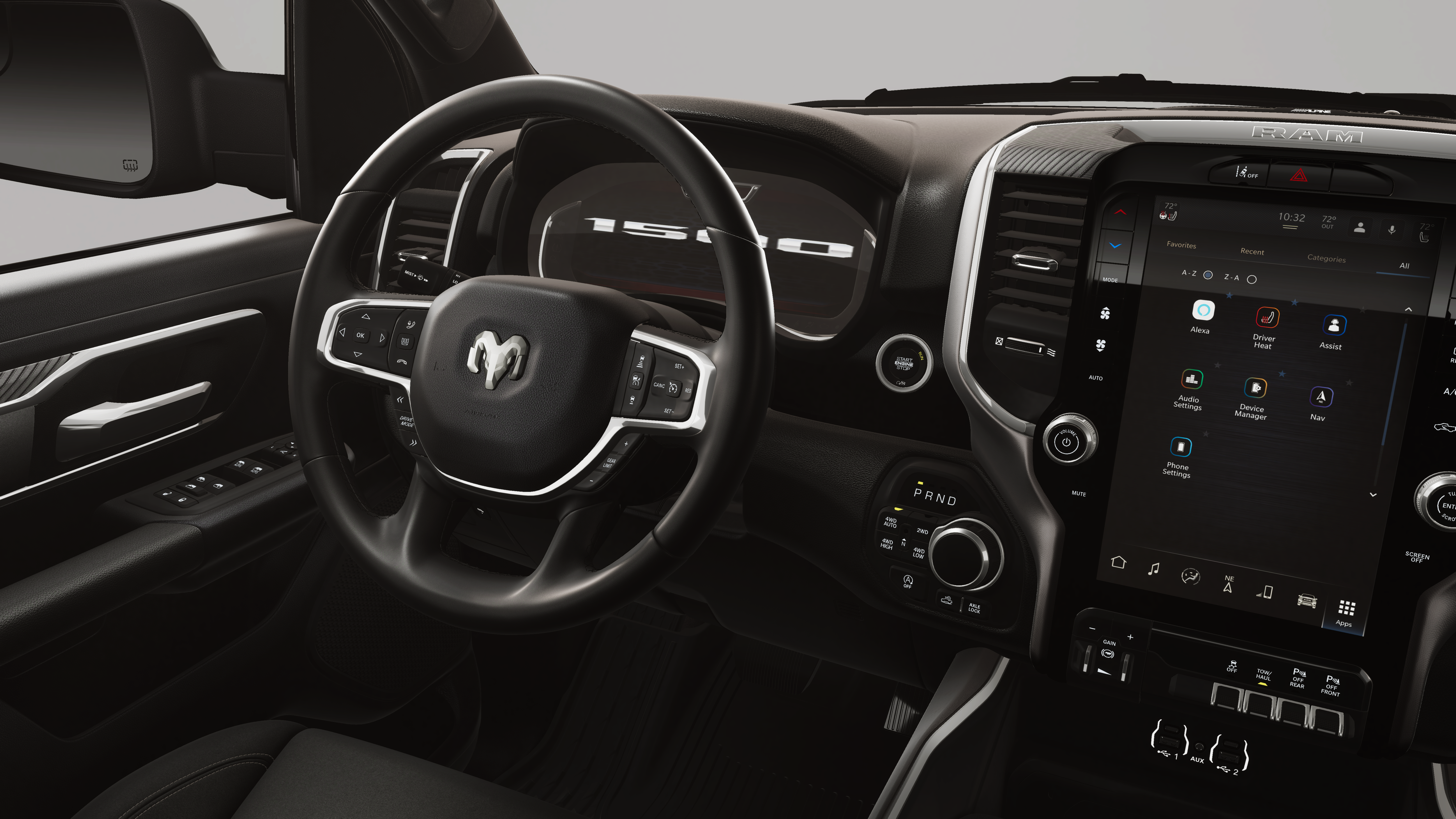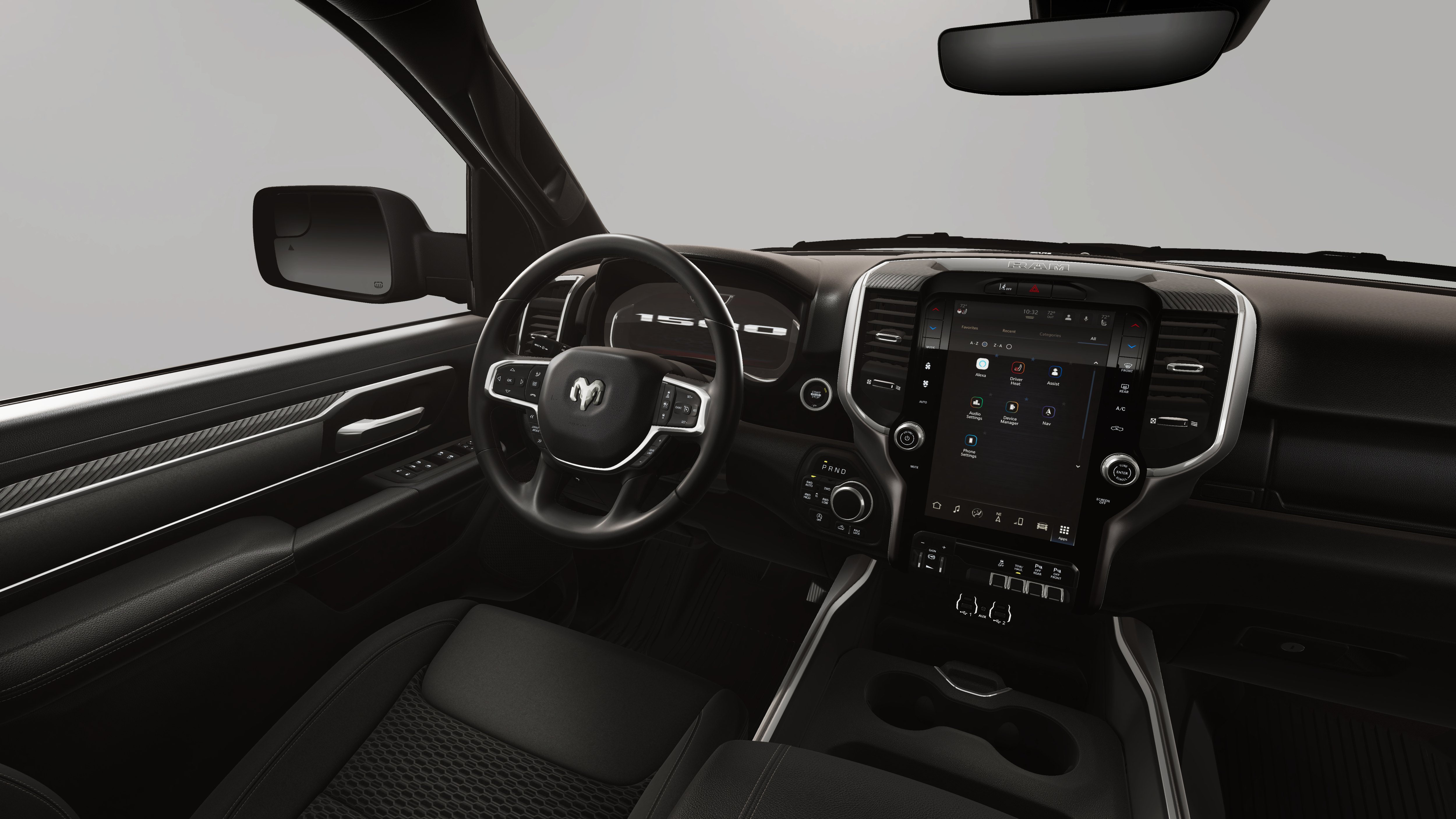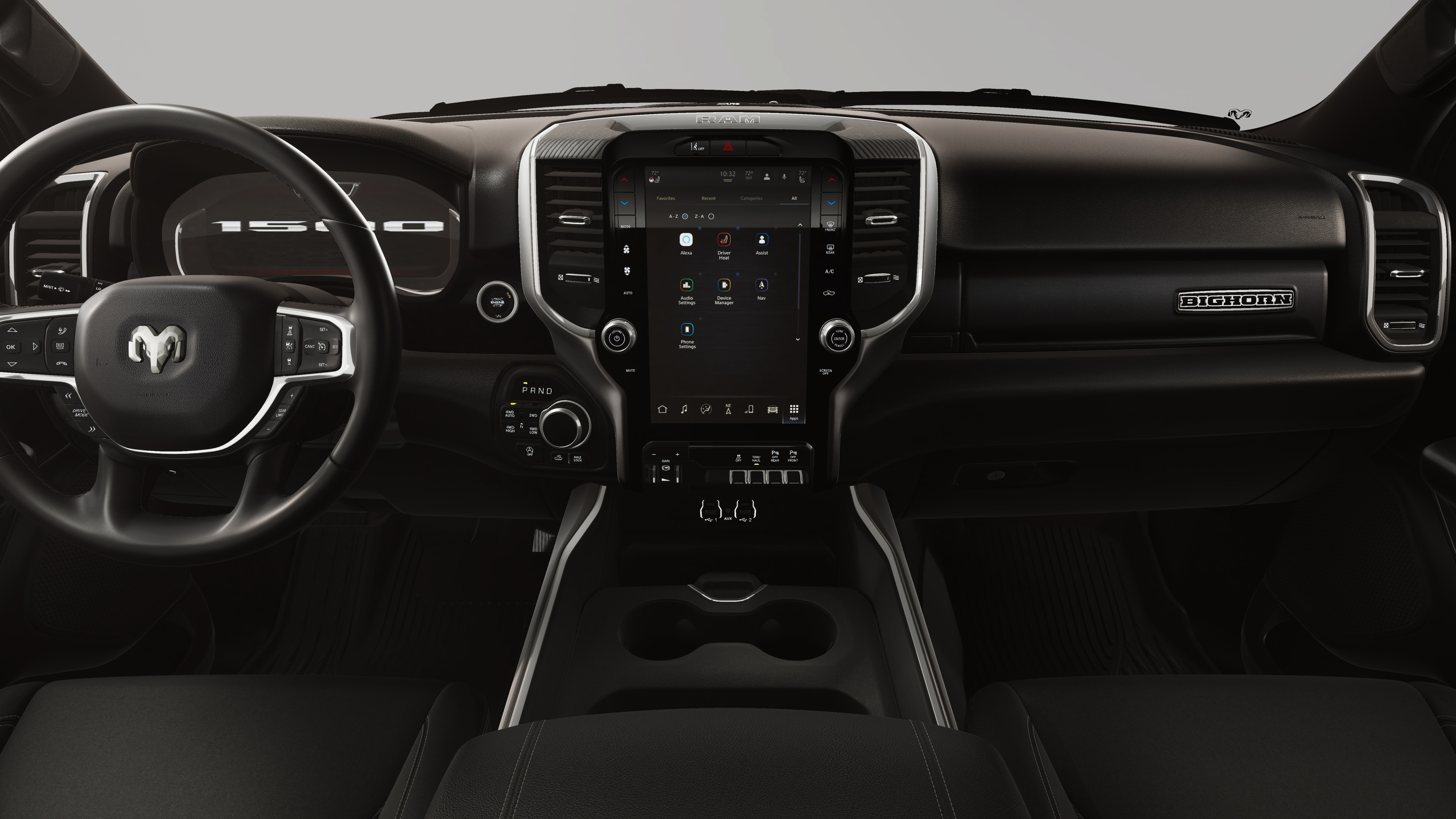 115V Auxiliary Power Outlet, 115V Auxiliary Rear Power Outlet, 12 Touchscreen Display, 2nd Row in Floor Storage Bins, 3 Rear Seat Head Restraints, 4 Way Front Headrests, 4-Wheel Disc Brakes, 400W Inverter, 48V Belt Starter Generator, 4G LTE Wi-Fi Hot Spot, 6 Speakers, 9 Amplified Speakers with Subwoofer, ABS brakes, Accent Color Door Handles, Accent Color Premium Power Mirrors, Accent Color Tailgate Handle, Air Conditioning, Air Conditioning ATC with Dual Zone Control, Alloy wheels, AM/FM radio, Anti-Spin Differential Rear Axle, Apple CarPlay, Apple CarPlay/Android Auto, Auto High-beam Headlights, Auto Power-Folding Mirrors, Auto-Dimming Exterior Driver Mirror, Auto-Dimming Rear-View Mirror, Big Horn Level 2 Equipment Group, Black Exterior Mirrors, Black Exterior Truck Badging, Black Headlamp Bezels, Black Interior Accents, Black Painted Exterior Mirrors Caps, Black Premium Power Mirrors, Black Tail Lamp Bezels, Body Color Fender Flares, Body Color Front Bumper, Body Color Rear Bumper with Step Pads, Brake assist, Bucket Seats, Bumpers: chrome, Center Console Parts Module, Cloth Bucket Seats, Cluster 12 TFT Color Display, Cluster 7.0 TFT Color Display, Compass, Configurable Drive Mode, Connected Travel and Traffic Services, Connectivity - US/Canada, Convex Wide-Angle Exterior Mirror Insert, Delay-off headlights, Deluxe Cloth Bucket Seats, Disassociated Touchscreen Display, Driver door bin, Dual Exhaust with Black Tips, Dual front impact airbags, Dual front side impact airbags, E-Locker Rear Axle, Electronic Stability Control, Exterior Mirrors Courtesy Lamps, Exterior Mirrors with Heating Element, Exterior Mirrors with Supplemental Signals, Front anti-roll bar, Front Bucket Seats, Front Center Armrest w/Storage, Front Extra Heavy Duty Shock Absorbers, Front fog lights, Front License Plate Bracket, Front reading lights, Front Seat Back Map Pockets, Front wheel independent suspension, Full Length Floor Console, Fully automatic headlights, Global Telematics Box Module, Glove Box Lamp, Google Android Auto, GPS Antenna Input, GPS Navigation, Grille Black Surround Black Mesh, HD Radio, Heated door mirrors, Heated Front Seats, Heated Steering Wheel, Illuminated entry, Integrated Center Stack Radio, Integrated Voice Command with Bluetooth®, Leather Wrapped Steering Wheel, LED Dome Lamp with on/Off Switch, LED Footwell Lighting, Low tire pressure warning, Manual Adjust 4-Way Driver Seat, Manual Adjust 4-Way Front Passenger Seat, Manual Folding Exterior Mirrors, Media Hub with 2 Charge Only USBs, MOPAR Front and Rear Rubber Floor Mats, Night Edition, Occupant sensing airbag, Off Road Decals, Off Road Group, Outside temperature display, Overhead airbag, Overhead console, Overhead LED Lamps, Panic alarm, ParkView Rear Back-Up Camera, Passenger door bin, Passenger vanity mirror, Power 2-Way Driver Lumbar Adjust, Power Adjust 8-Way Driver Seat, Power Adjustable Pedals, Power door mirrors, Power steering, Power windows, Premium Overhead Console, Quick Order Package 27Z Big Horn, Radio data system, Radio: Uconnect 5 Navigation with 12.0 Display, Radio: Uconnect 5 W with 8.4 Display, Raised Ride Height, RAM Grille Badge - Black, RAM Grille Badge - Chrome, Rear 60/40 Folding Seat, Rear anti-roll bar, Rear Center Armrest, Rear Extra Heavy Duty Shock Absorbers, Rear Power Sliding Window, Rear step bumper, Rear Underseat Compartment Storage, Rear Window Defroster, Remote keyless entry, Remote Tailgate Release, Security Alarm, Selec-Speed Control, SiriusXM Radio Service, SiriusXM with 360L, Speed control, Steering Wheel Mounted Audio Controls, Sun Visors with Illuminated Vanity Mirrors, Supplier Part Tracking (J-1), Tachometer, Telescoping steering wheel, Tilt steering wheel, Tow Hooks, Traction control, Trailer Brake Control, Trip computer, Universal Garage Door Opener, USB Host