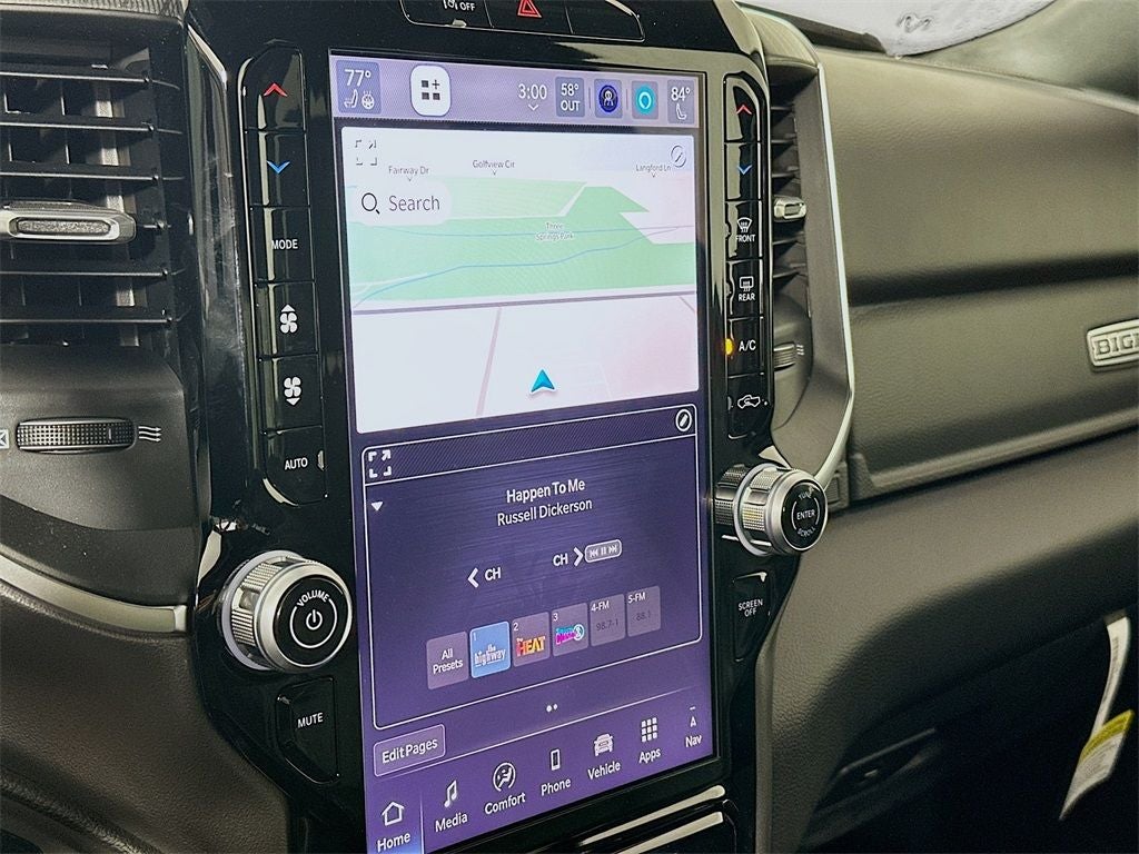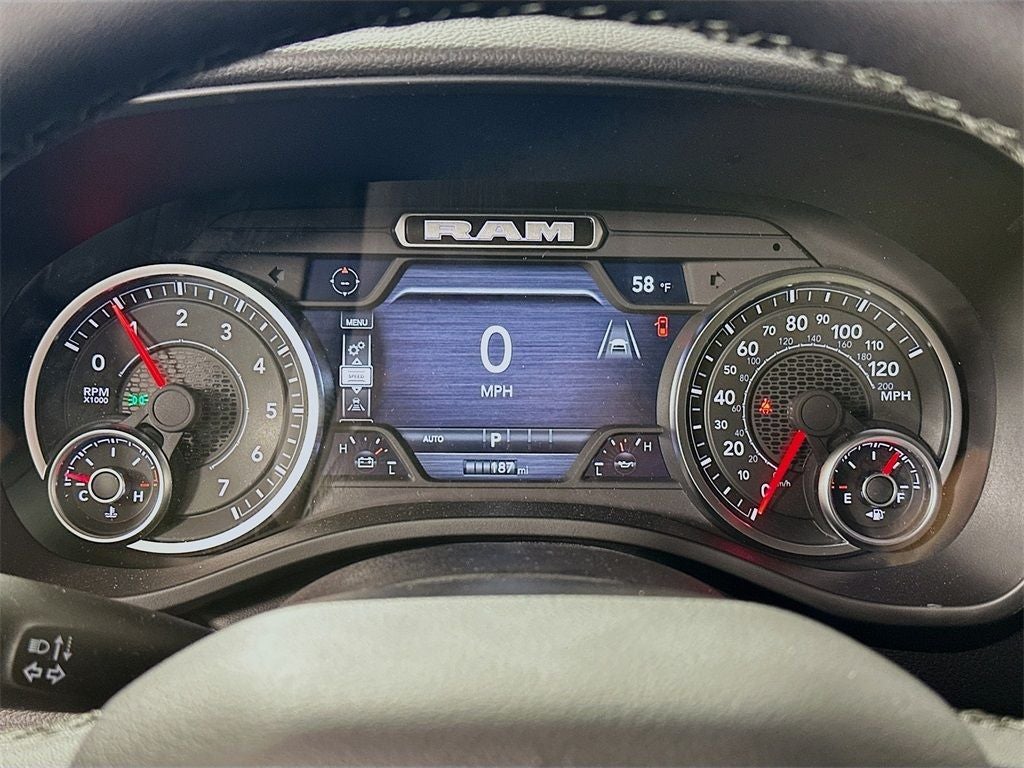 115V Auxiliary Power Outlet, 115V Auxiliary Rear Power Outlet, 12 Touchscreen Display, 2nd Row in Floor Storage Bins, 3 Rear Seat Head Restraints, 4 Way Front Headrests, 4-Wheel Disc Brakes, 400W Inverter, 48V Belt Starter Generator, 4G LTE Wi-Fi Hot Spot, 6 Speakers, 9 Amplified Speakers with Subwoofer, ABS brakes, Accent Color Door Handles, Accent Color Premium Power Mirrors, Accent Color Tailgate Handle, Air Conditioning, Air Conditioning ATC with Dual Zone Control, Alloy wheels, AM/FM radio, Anti-Spin Differential Rear Axle, Apple CarPlay, Apple CarPlay/Android Auto, Auto High-beam Headlights, Auto Power-Folding Mirrors, Auto-Dimming Exterior Driver Mirror, Auto-Dimming Rear-View Mirror, Big Horn Level 2 Equipment Group, Black Exterior Mirrors, Black Exterior Truck Badging, Black Headlamp Bezels, Black Interior Accents, Black Painted Exterior Mirrors Caps, Black Premium Power Mirrors, Black Tail Lamp Bezels, Body Color Fender Flares, Body Color Front Bumper, Body Color Rear Bumper with Step Pads, Brake assist, Bucket Seats, Bumpers: chrome, Center Console Parts Module, Cloth Bucket Seats, Cluster 7.0 TFT Color Display, Compass, Configurable Drive Mode, Connected Travel and Traffic Services, Connectivity - US/Canada, Convex Wide-Angle Exterior Mirror Insert, Delay-off headlights, Deluxe Cloth Bucket Seats, Disassociated Touchscreen Display, Driver door bin, Dual Exhaust with Black Tips, Dual front impact airbags, Dual front side impact airbags, Electronic Stability Control, Exterior Mirrors Courtesy Lamps, Exterior Mirrors with Heating Element, Exterior Mirrors with Supplemental Signals, Front anti-roll bar, Front Bucket Seats, Front Center Armrest w/Storage, Front fog lights, Front License Plate Bracket, Front reading lights, Front Seat Back Map Pockets, Front wheel independent suspension, Full Length Floor Console, Fully automatic headlights, Global Telematics Box Module, Glove Box Lamp, Google Android Auto, GPS Antenna Input, GPS Navigation, Grille Black Surround Black Mesh, HD Radio, Heated door mirrors, Heated Front Seats, Heated Steering Wheel, Illuminated entry, Integrated Center Stack Radio, Integrated Voice Command with Bluetooth®, Leather Wrapped Steering Wheel, LED Dome Lamp with on/Off Switch, LED Footwell Lighting, Low tire pressure warning, Manual Adjust 4-Way Driver Seat, Manual Adjust 4-Way Front Passenger Seat, Manual Folding Exterior Mirrors, Media Hub with 2 Charge Only USBs, Night Edition, Occupant sensing airbag, Outside temperature display, Overhead airbag, Overhead console, Overhead LED Lamps, Panic alarm, ParkView Rear Back-Up Camera, Passenger door bin, Passenger vanity mirror, Power 2-Way Driver Lumbar Adjust, Power Adjust 8-Way Driver Seat, Power Adjustable Pedals, Power door mirrors, Power steering, Power windows, Premium Overhead Console, Quick Order Package 27Z Big Horn, Radio data system, Radio: Uconnect 5 Navigation with 12.0 Display, Radio: Uconnect 5 W with 8.4 Display, RAM Grille Badge - Black, RAM Grille Badge - Chrome, Rear 60/40 Folding Seat, Rear anti-roll bar, Rear Center Armrest, Rear Power Sliding Window, Rear step bumper, Rear Window Defroster, Remote keyless entry, Remote Tailgate Release, Security Alarm, SiriusXM Radio Service, SiriusXM with 360L, Speed control, Steering Wheel Mounted Audio Controls, Sun Visors with Illuminated Vanity Mirrors, Supplier Part Tracking (J-1), Tachometer, Telescoping steering wheel, Tilt steering wheel, Traction control, Trailer Brake Control, Trip computer, Universal Garage Door Opener, USB Host Flip, Variably intermittent wipers, Voltmeter, Wheels: 20 x 9.0 Aluminum Painted Clad.