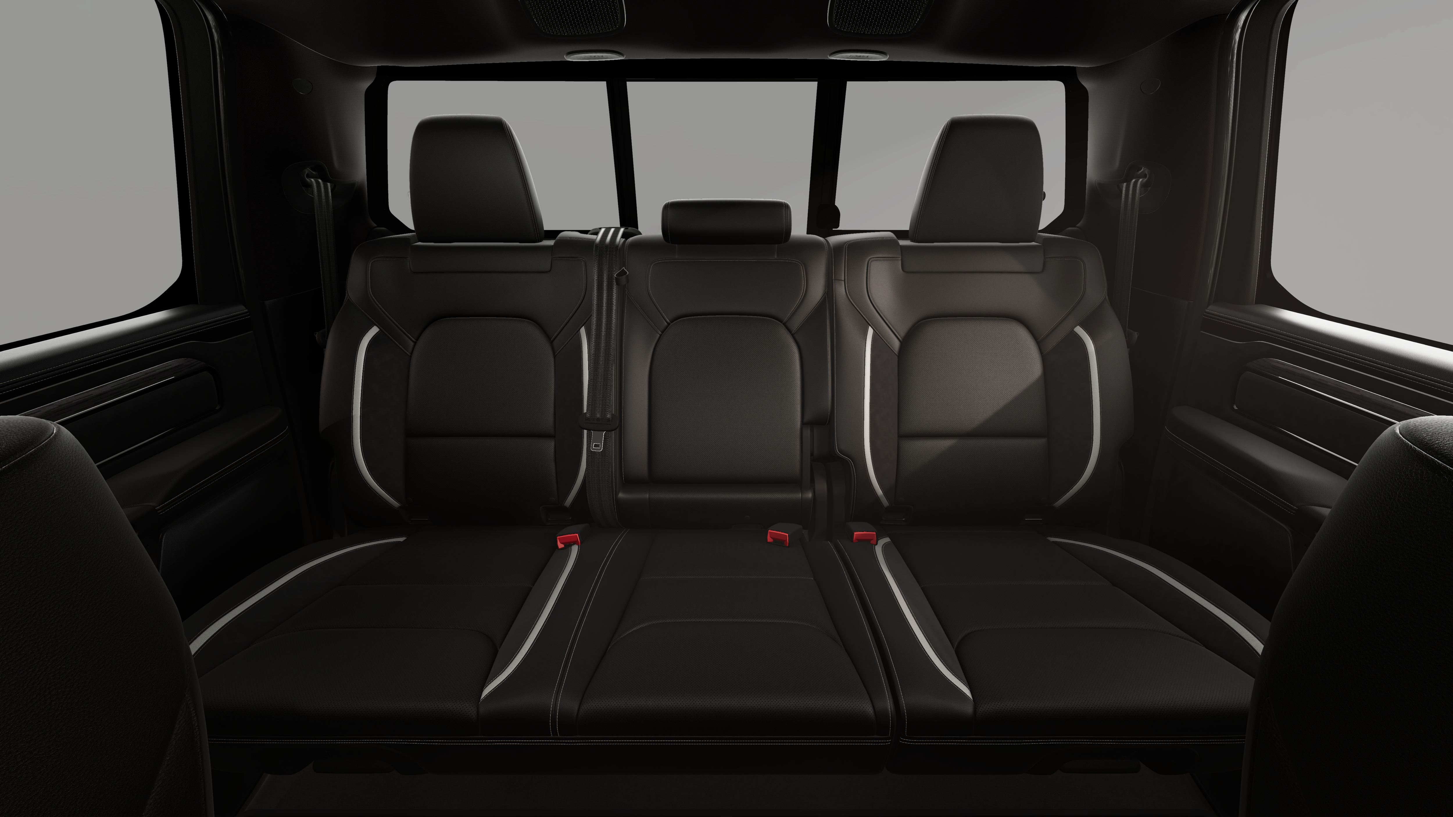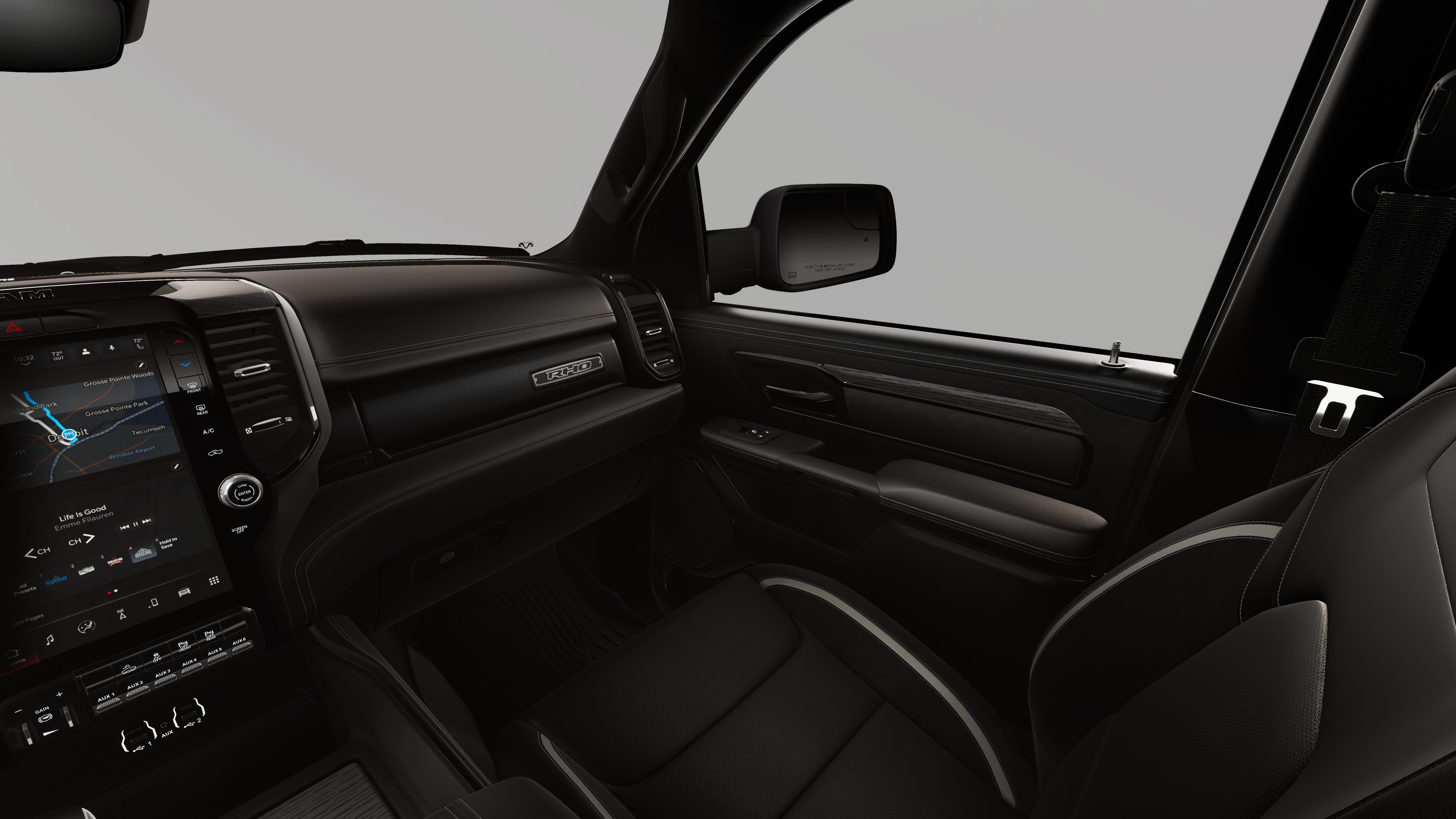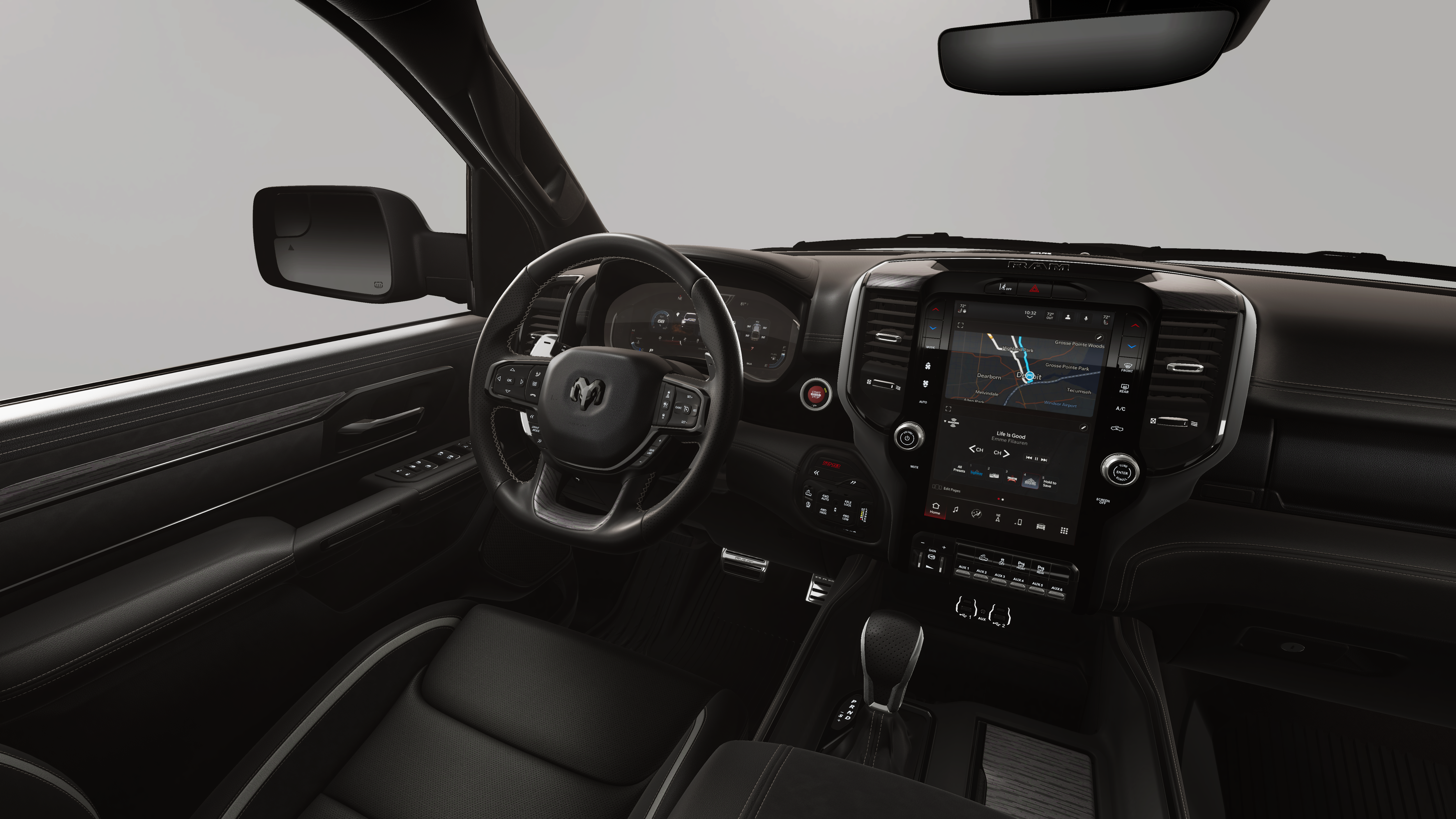 10 Speakers, 3.92 Rear Axle Ratio, 4-Wheel Disc Brakes, 4G LTE Wi-Fi Hot Spot, ABS brakes, Adaptive suspension, Adjustable pedals, Air Conditioning, Alloy wheels, AM/FM radio, Apple CarPlay/Android Auto, Auto High-beam Headlights, Auto Power-Folding Mirrors, Auto-dimming door mirrors, Auto-Dimming Exterior Driver Mirror, Auto-dimming Rear-View mirror, Automatic temperature control, Brake assist, Compass, Connected Travel and Traffic Services, Connectivity - US/Canada, Delay-off headlights, Disassociated Touchscreen Display, Driver door bin, Driver vanity mirror, Dual front impact airbags, Dual front side impact airbags, Electronic Stability Control, Exterior Mirrors Courtesy Lamps, Exterior Mirrors with Heating Element, Exterior Mirrors with Supplemental Signals, Exterior Parking Camera Rear, Flareside Box, Front anti-roll bar, Front Bucket Seats, Front Center Armrest w/Storage, Front dual zone A/C, Front fog lights, Front License Plate Bracket, Front reading lights, Front wheel independent suspension, Fully automatic headlights, Garage door transmitter, GPS Navigation, HD Radio, Heated door mirrors, Heated front seats, Heated steering wheel, Illuminated entry, Integrated Center Stack Radio, Integrated Voice Command with Bluetooth®, Leather Shift Knob, Leather steering wheel, Leather Trimmed Bucket Seats, Low tire pressure warning, Navigation System, Occupant sensing airbag, Outside temperature display, Overhead airbag, Overhead console, Panic alarm, Passenger door bin, Passenger vanity mirror, Power door mirrors, Power driver seat, Power passenger seat, Power steering, Power windows, Quick Order Package 22Y RHO, Radio data system, Radio: Uconnect 5 Navigation with 12.0 Display, Rear reading lights, Rear seat center armrest, Rear step bumper, Rear window defroster, Remote keyless entry, Security system, SiriusXM Radio Service, Speed control, Split folding rear seat, Sport steering wheel, Steering wheel mounted audio controls, Tachometer, Telescoping steering wheel, Tilt steering wheel, Traction control, Trip computer, Turn signal indicator mirrors, USB Host Flip, Variably intermittent wipers, Voltmeter, Wheels: 18 x 9 Black Paint/Polish Aluminum.