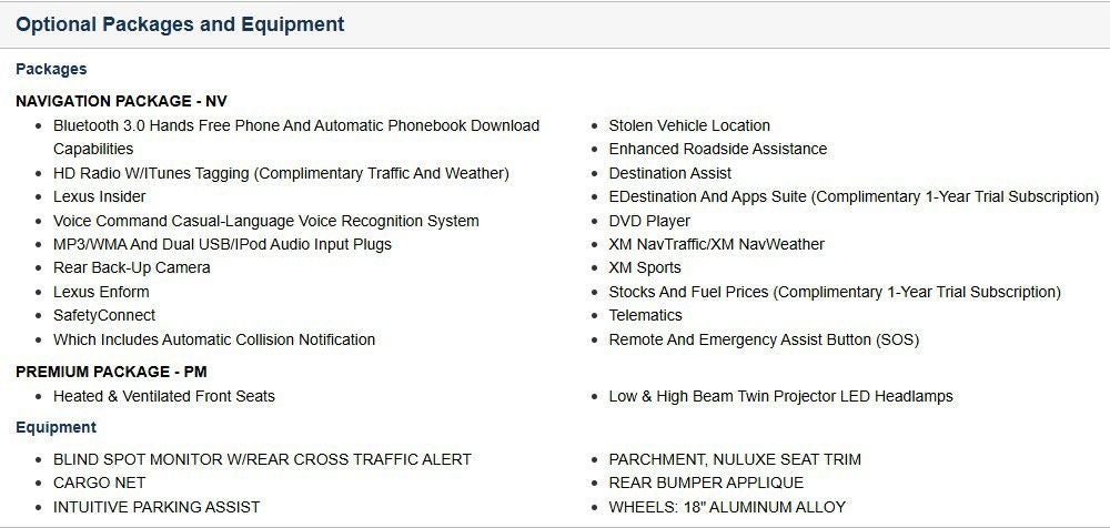 - Radio: Lexus Display Audio -inc: 7-inch VGA screen, 8 speakers, AM/FM radio, single in-dash CD changer, digital signal processing w/Automatic Sound Levelizer (ASL), HD Radio (complimentary traffic and weather), integrated SiriusXM satellite radio receiver (complimentary 90-day trial subscription included), iTunes tagging, MP3/WMA and dual USB/iPod audio input plugs, rear glass-imprinted radio antenna w/separate FM diversity antenna, streaming audio via Bluetooth® 3.0 and voice recognition