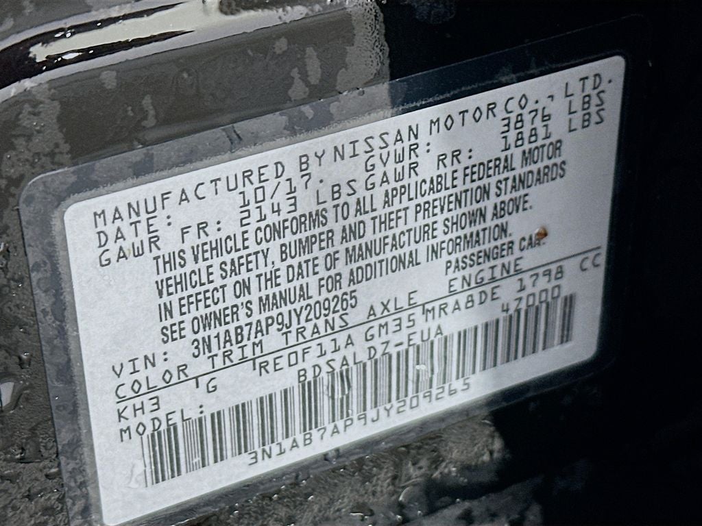2018 Nissan Sentra SV 1.8L 4-Cylinder DOHC 16V CVT with Xtronic FWD 4D Sedan Super Black 29/37 City/Highway MPG LOCAL TRADE, Backup Camera, Bluetooth®, Hands-Free, Push Button Start, Sentra SV, 4D Sedan, Super Black, 16 x 6.5 Aluminum Alloy Wheels, Brake assist, Carpeted Floor Mats w/Trunk Mat, Delay-off headlights, Electronic Stability Control, Exterior Parking Camera Rear, Illuminated entry, Power door mirrors, Power windows, 6 Speakers, ABS brakes, Activation Disclaimer, Air Conditioning, AM/FM radio: SiriusXM, AM/FM/CD Audio System, Automatic temperature control, Body Colored Splash Guards (4 Piece), Bumpers: body-color, CD player, Driver door bin, Driver vanity mirror, Dual front impact airbags, Dual front side impact airbags, Front anti-roll bar, Front Bucket Seats, Front Center Armrest, Front dual zone A/C, Front reading lights, Front wheel independent suspension, Fully automatic headlights, Low tire pressure warning, Occupant sensing airbag, Outside temperature display, Overhead airbag, Overhead console, Panic alarm, Passenger door bin, Passenger vanity mirror, Power steering, Premium Cloth Seat Trim, Radio data system, Rear anti-roll bar, Rear seat center armrest, Rear USB Ports (H11), Rear window defroster, Remote keyless entry, Security system, Speed control, Speed-sensing steering, Split folding rear seat, Steering wheel mounted audio controls, Tachometer, Telescoping steering wheel, Tilt steering wheel, Traction control, Trip computer, Variably intermittent wipers, Sentra SV, 4D Sedan, Super Black, 16 x 6.5 Aluminum Alloy Wheels, Brake assist, Carpeted Floor Mats w/Trunk Mat, Delay-off headlights, Electronic Stability Control, Exterior Parking Camera Rear, Illuminated entry, Power door mirrors, Power windows. 2025 Nissan Illinois Dealer of the Year! CarFax Top-Rated Dealer Sixth year in a row! Every vehicle is priced to sell and backed by our Customer Service Guaruntee. Located at 1130 Auffenberg Ave. Shiloh, IL 62269, only 18 Minutes from the St.Louis Arch! Located at Auffenberg Nissan. 1130 Auffenberg Ave. Shiloh, IL 62269.